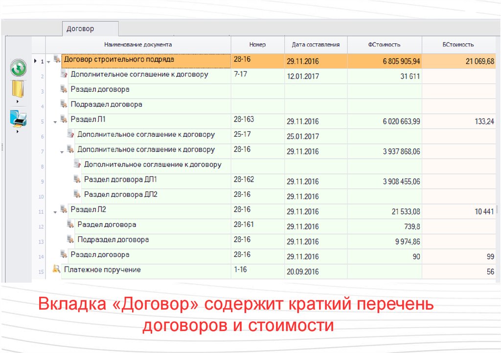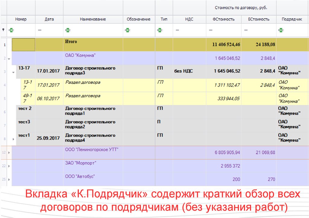 Вкладка «К.Подрядчик» содержит краткий обзор всехдоговоров по подрядчикам (без указания работ)