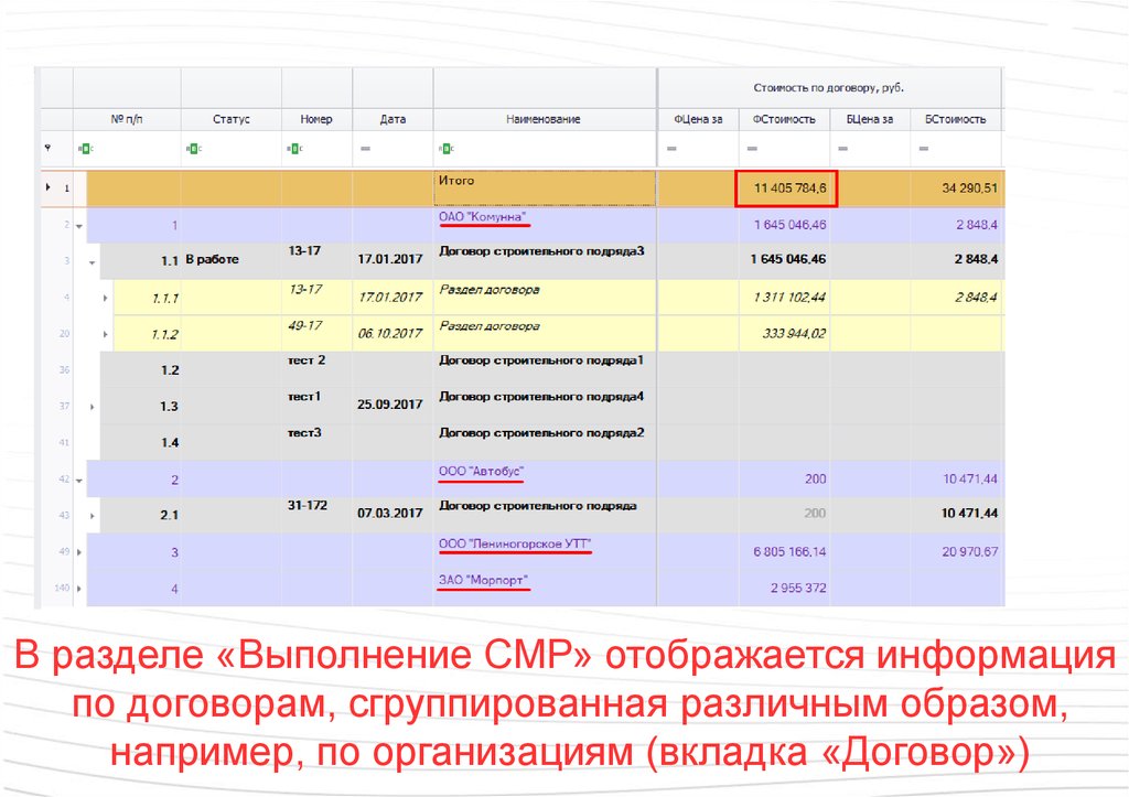 В разделе «Выполнение СМР» отображается информацияпо договорам, сгруппированная различным образом,