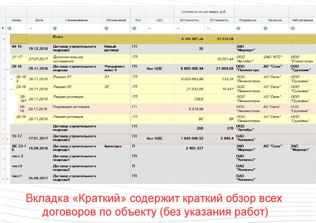 Вкладка «Краткий» содержит краткий обзор всехдоговоров по объекту (без указания работ)