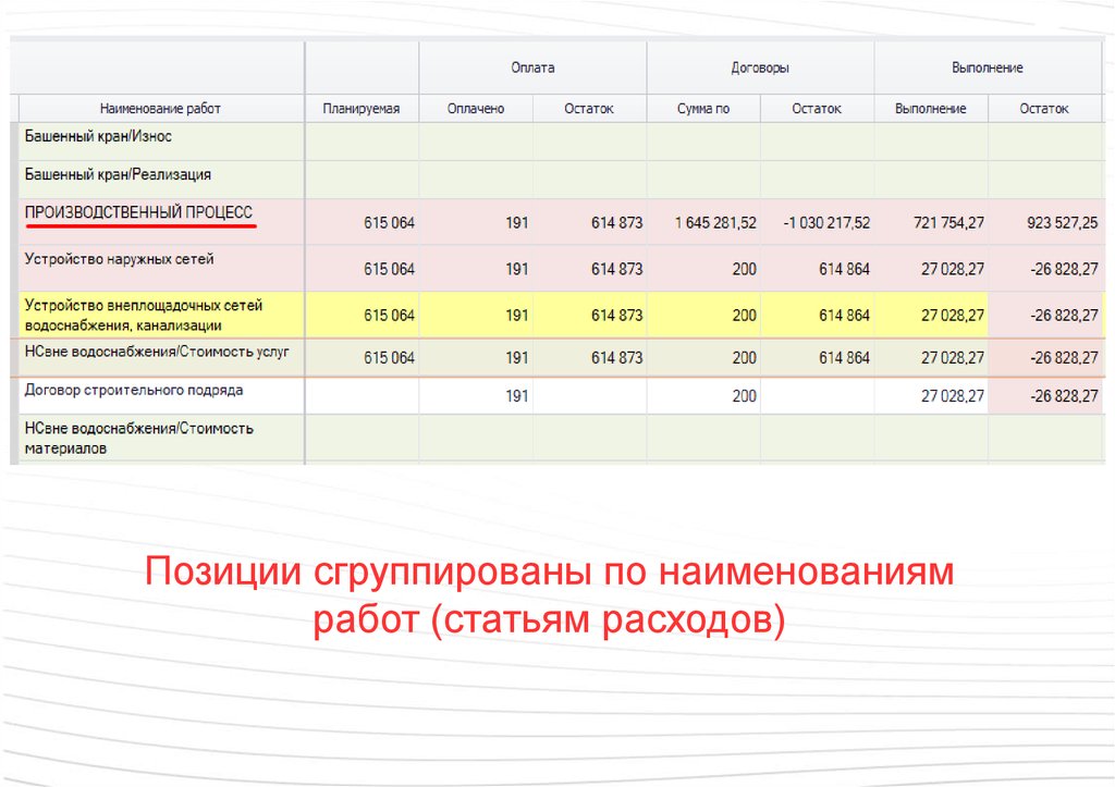 Позиции сгруппированы по наименованиямработ (статьям расходов)