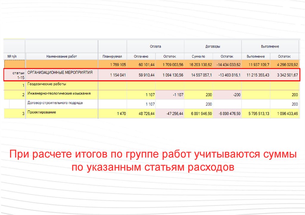При расчете итогов по группе работ учитываются суммыпо указанным статьям расходов