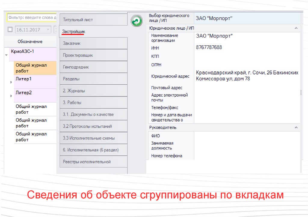 ИсполнительнаяЖурнал содержит введенные ранее сведения об объекте