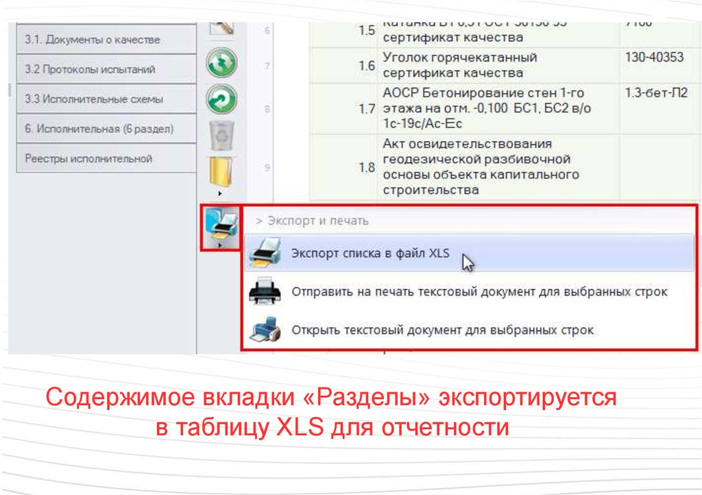 Содержимое вкладки «Разделы» экспортируетсяв таблицу XLS для отчетности