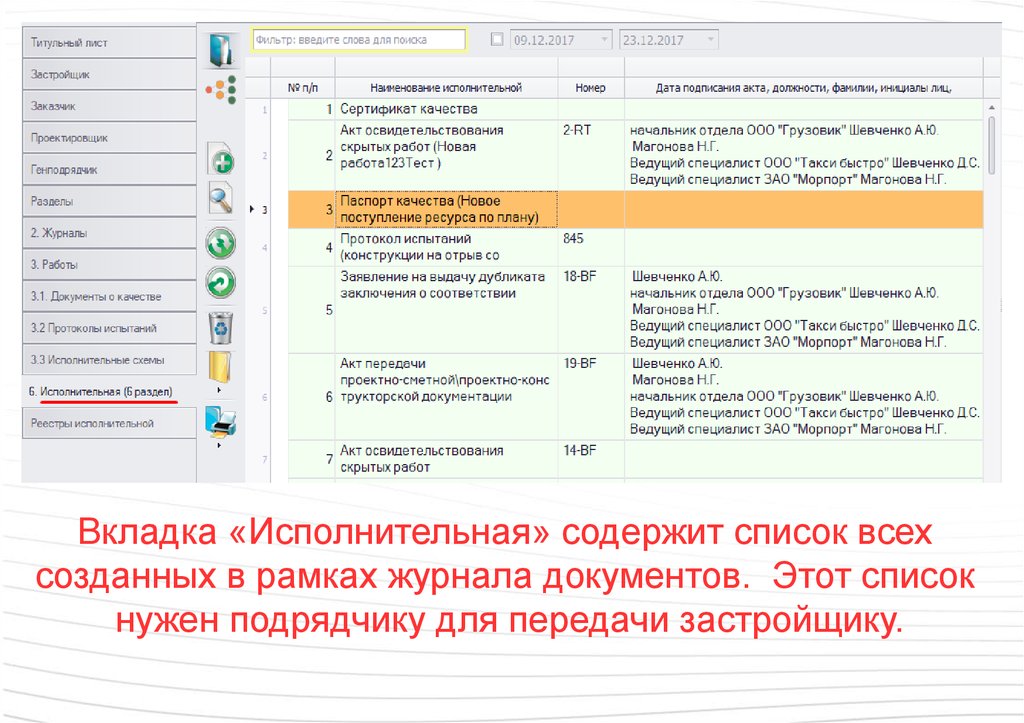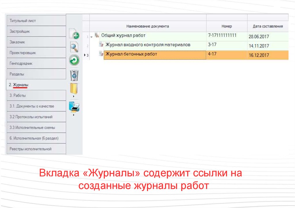 Вкладка «Исполнительная» содержит список всехсозданных в рамках журнала документов. Этот список