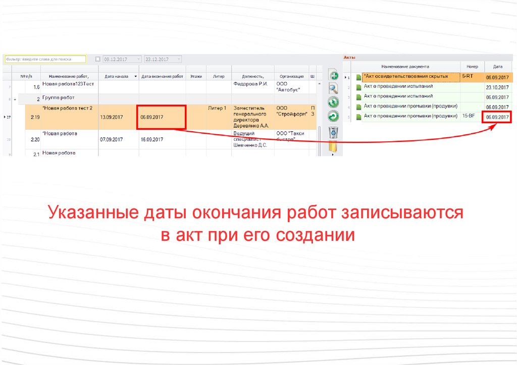 Указанные даты окончания работ записываютсяв акт при его создании