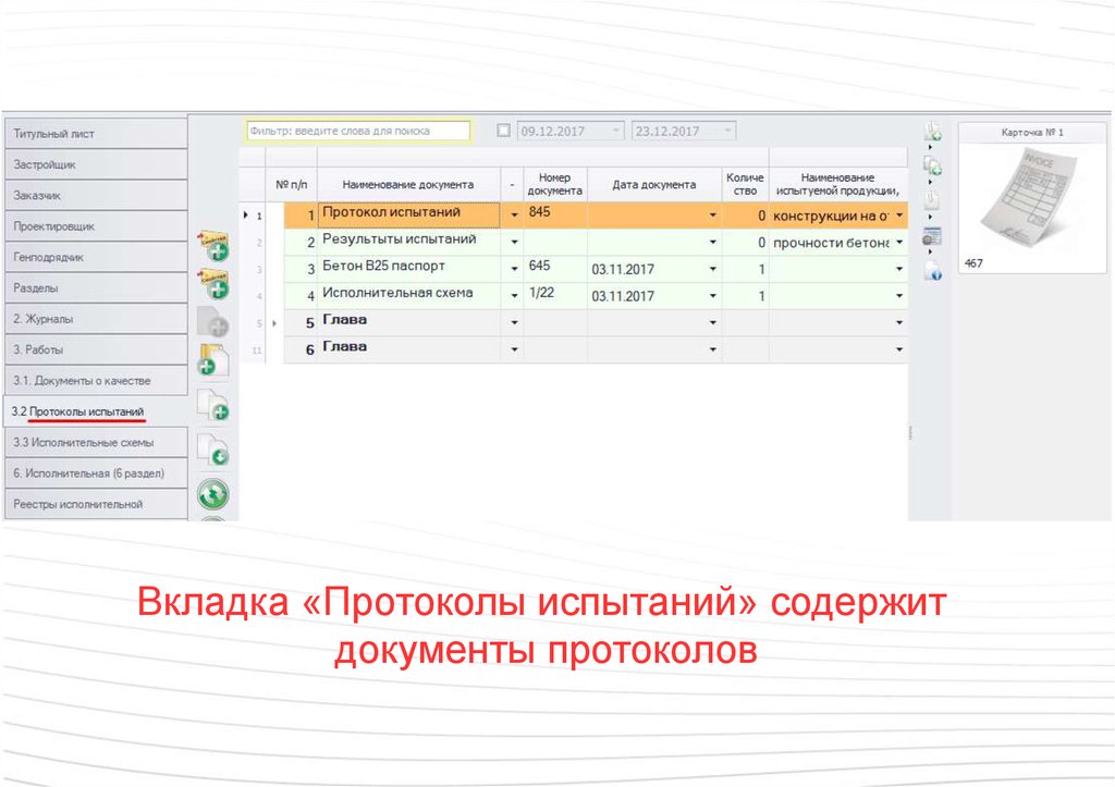Вкладка «Протоколы испытаний» содержитдокументы протоколов