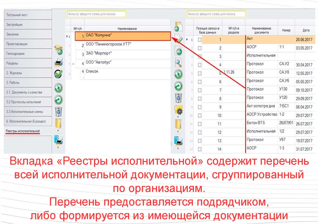 Вкладка «Реестры исполнительной» содержит переченьвсей исполнительной документации, сгруппированный