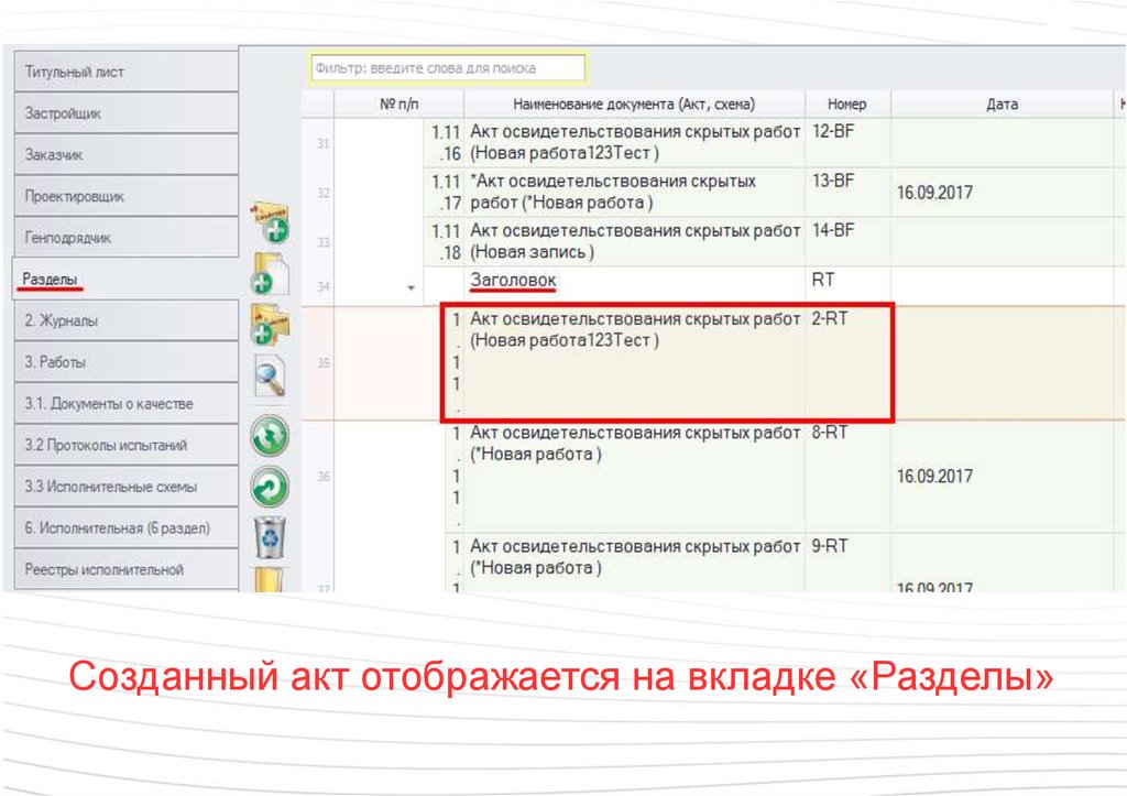 Созданный акт отображается на вкладке «Разделы»77.