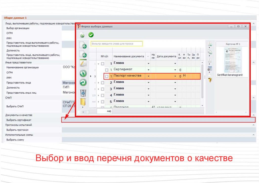 Выбор и ввод перечня документов о качестве80.