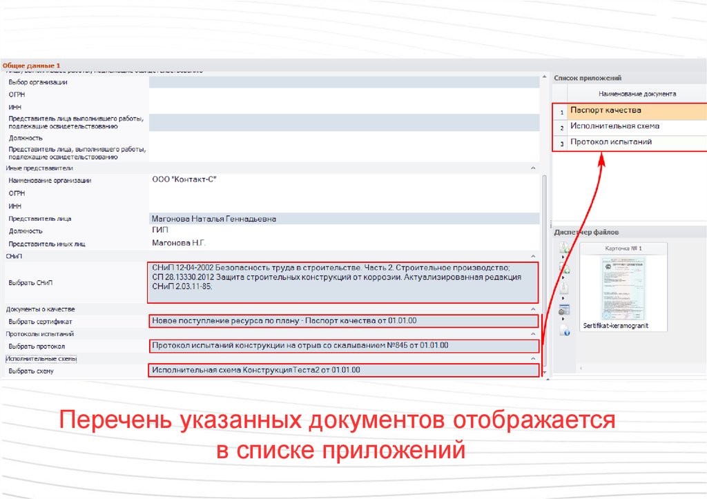 Перечень указанных документов отображаетсяв списке приложений
