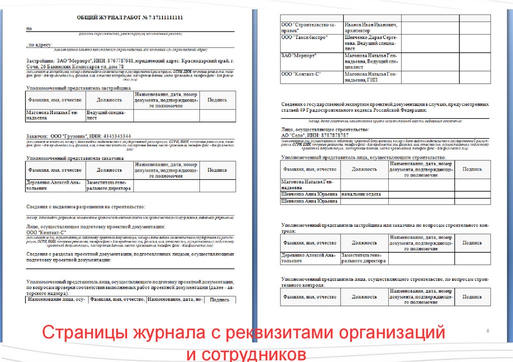 Страницы журнала с реквизитами организацийи сотрудников