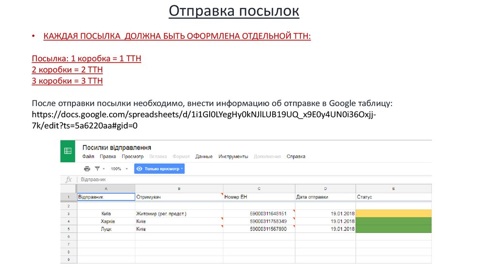 • Информация о посылках находится в Google таблице.