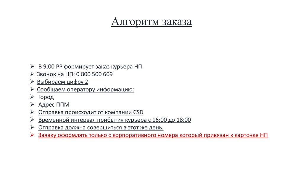 Алгоритм заказаВ 9:00 РР формирует заказ курьера НП: