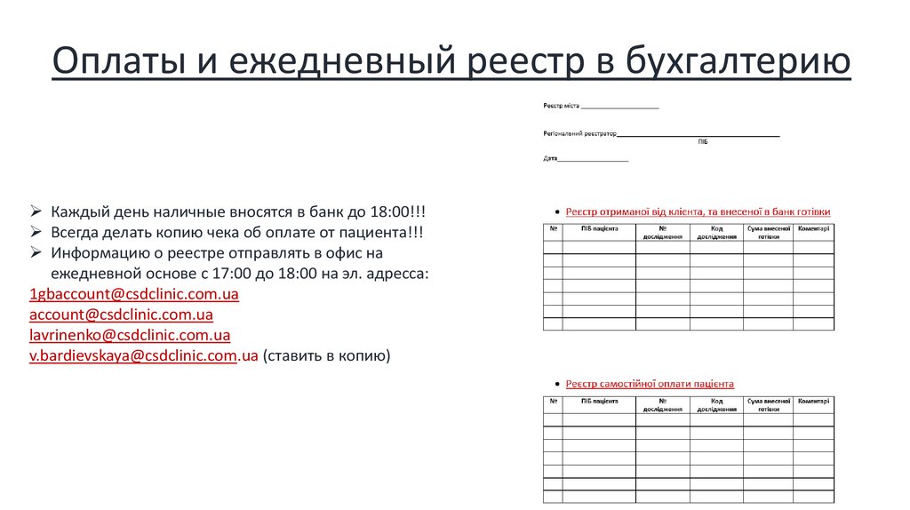 Оплаты и ежедневный реестр в бухгалтериюКаждый день наличные вносятся в банк до 18:00!!!
