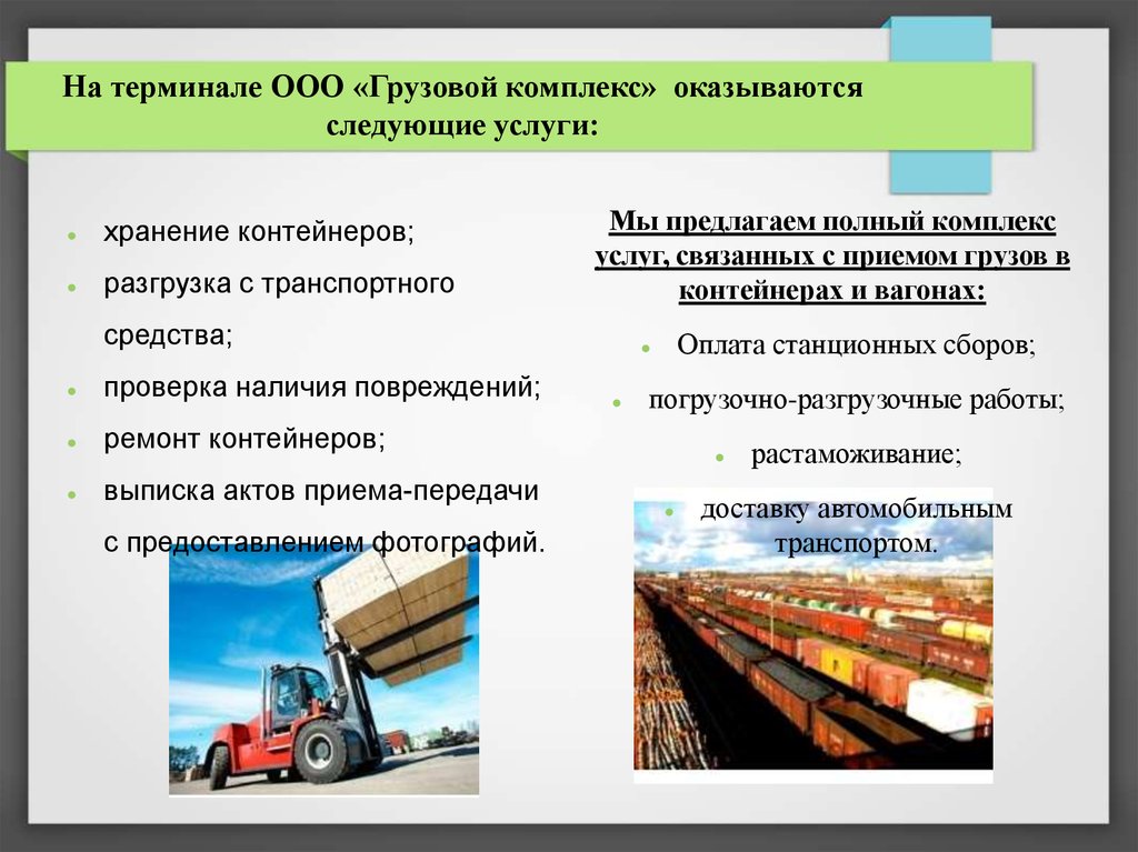 На терминале ООО «Грузовой комплекс» оказываютсяследующие услуги:
