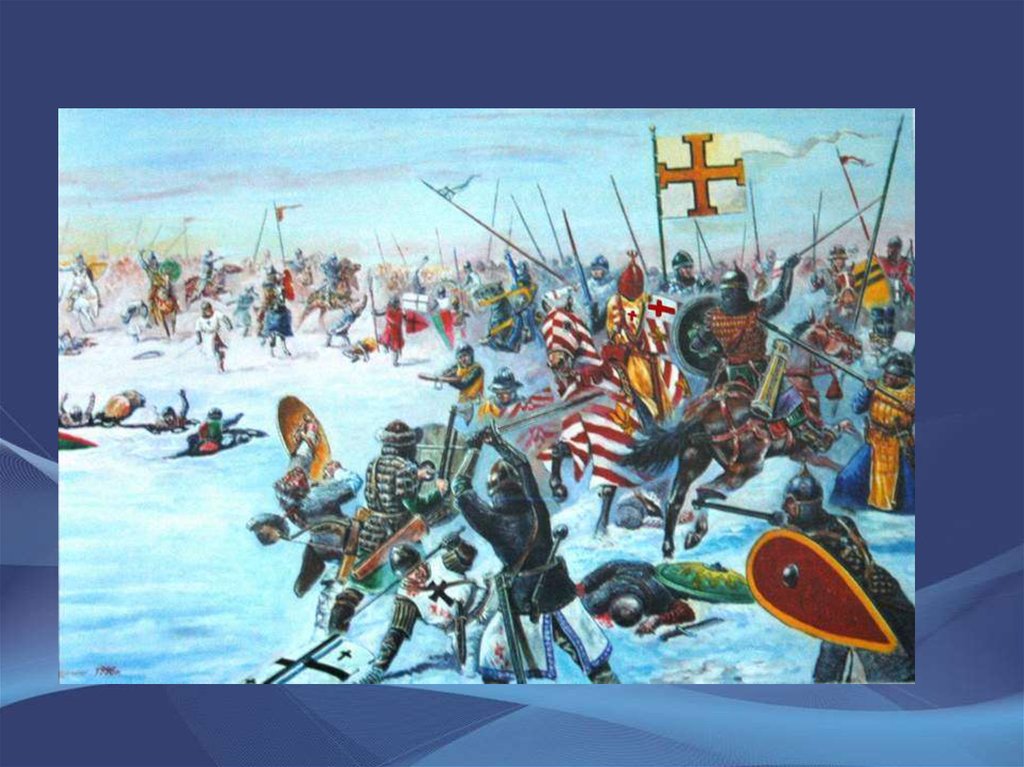 14. Собрав достаточно сил, Александр решает дать главное сражение 5 апреля 1242 года на льду Чудского озера. В историю эта битва