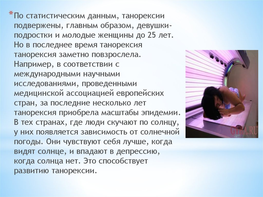 * По статистическим данным, танорексииподвержены, главным образом, девушкиподростки и молодые женщины до 25 лет.
