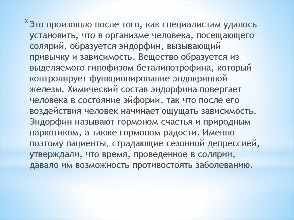 солярий, образуется эндорфин, вызывающий
