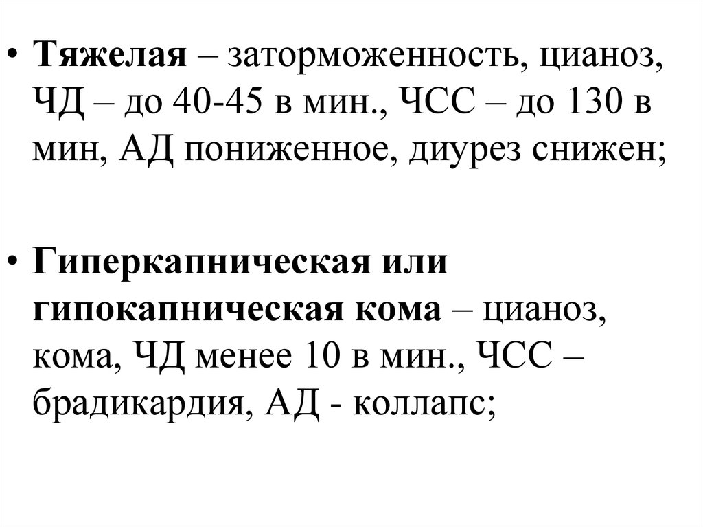• Легкая – сознание ясное, легкийцианоз губ, ЧД – до 25 в мин., ЧСС –
