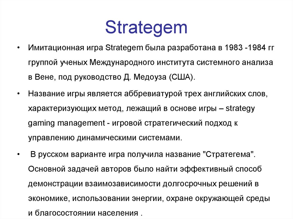 • Имитационная игра Strategem была разработана в 1983 -1984 гггруппой ученых Международного института системного анализа