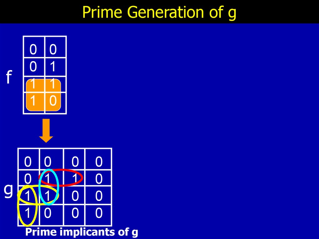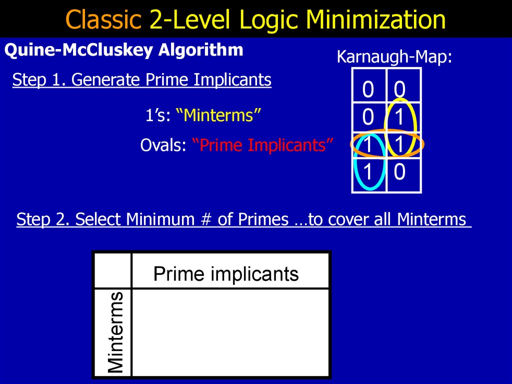 Classic (Quine-McCluskey):<On-set minterms, Prime implicants>