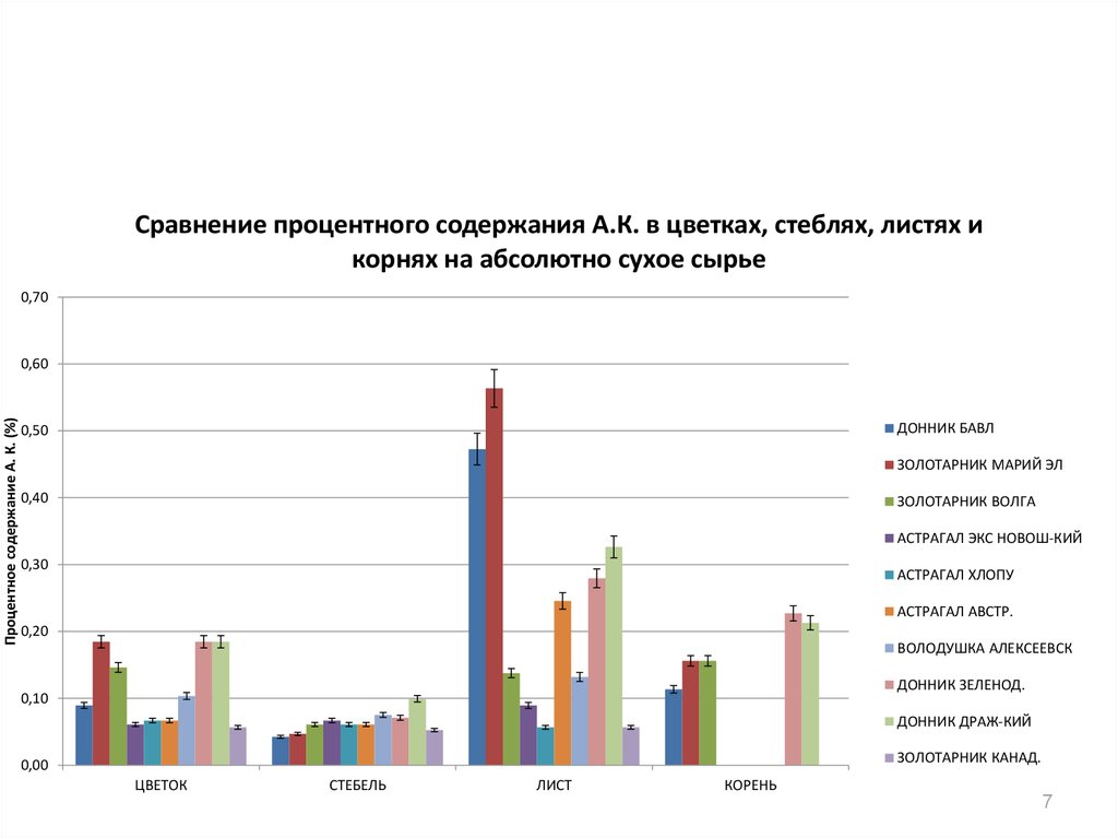 Сравнение процентного содержания А.К. в цветках, стеблях, листях икорнях на абсолютно сухое сырье