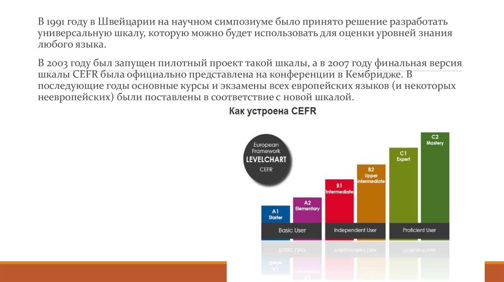 В 1991 году в Швейцарии на научном симпозиуме было принято решение разработатьуниверсальную шкалу, которую можно будет использовать для оценки уровней знания