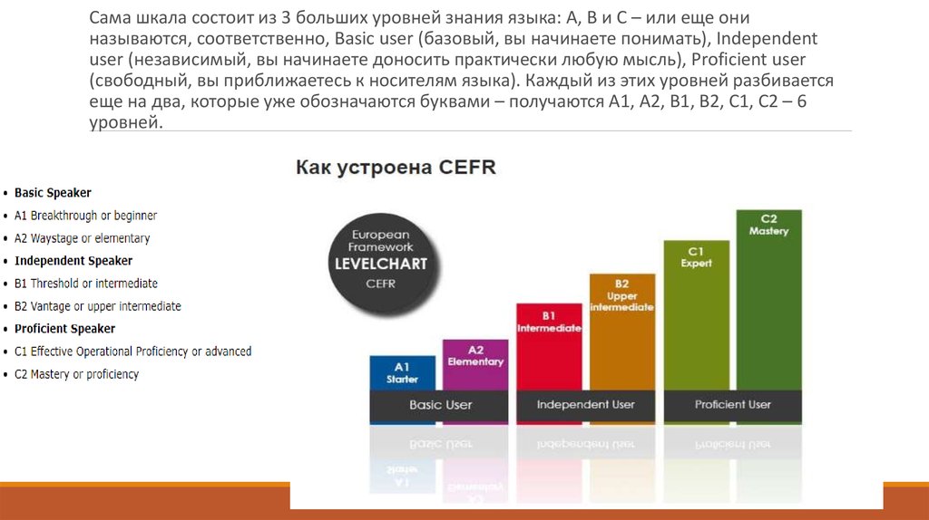 Сама шкала состоит из 3 больших уровней знания языка: A, B и C – или еще ониназываются, соответственно, Basic user (базовый, вы начинаете понимать), Independent