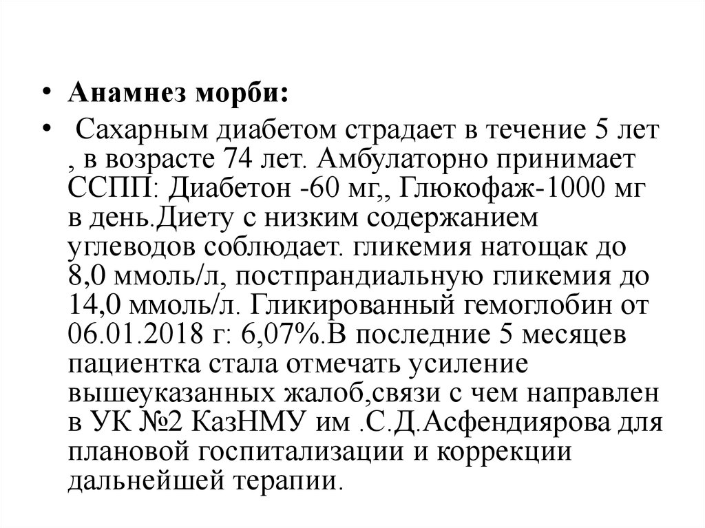 • Анамнез морби:• Сахарным диабетом страдает в течение 5 лет