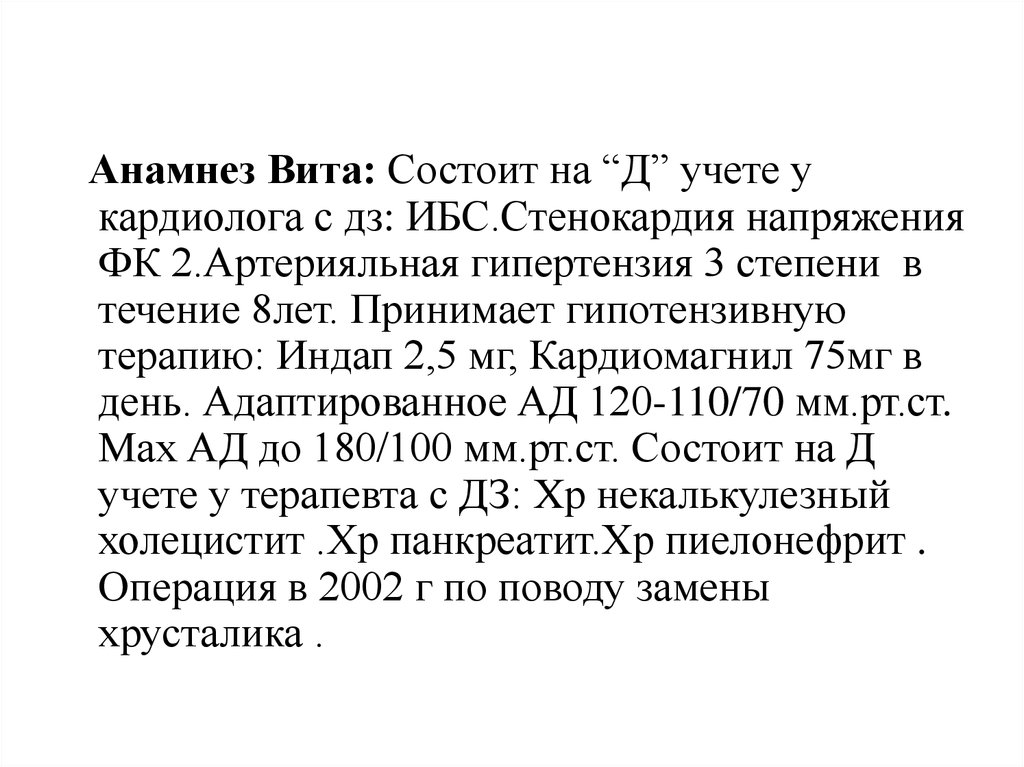 Анамнез Вита: Состоит на “Д” учете укардиолога с дз: ИБС.Стенокардия напряжения