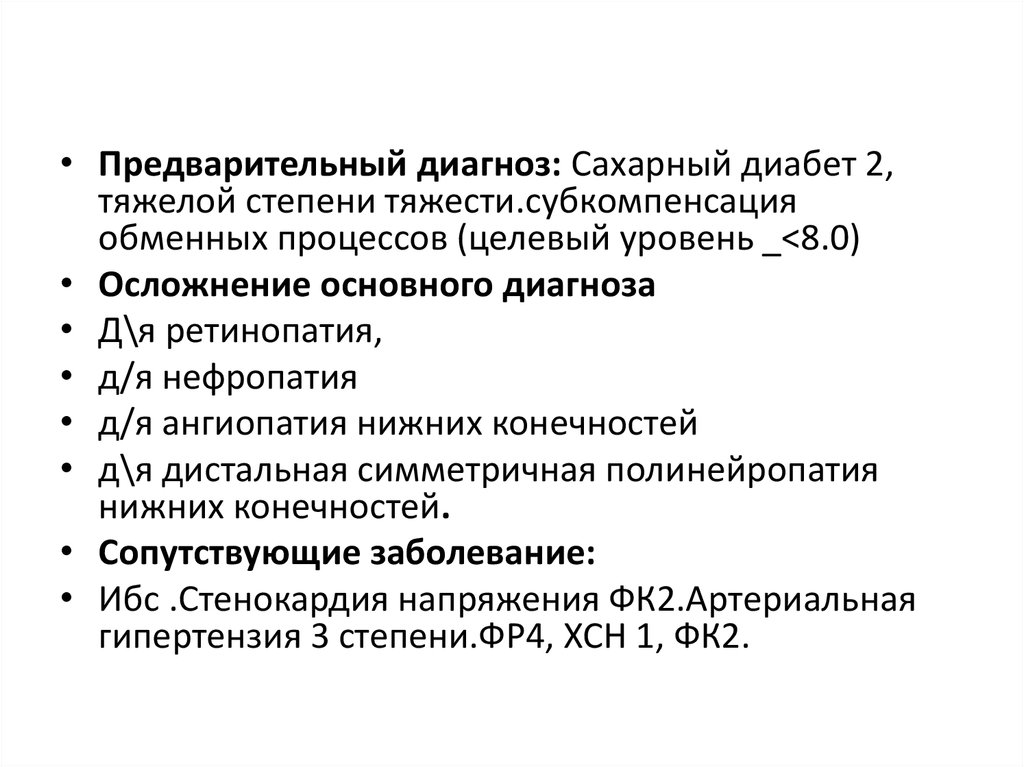 • Предварительный диагноз: Сахарный диабет 2,тяжелой степени тяжести.субкомпенсация