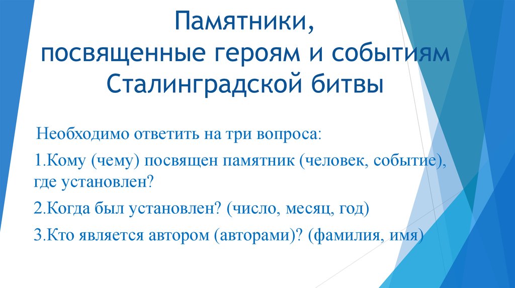Необходимо ответить на три вопроса:1.Кому (чему) посвящен памятник (человек, событие),