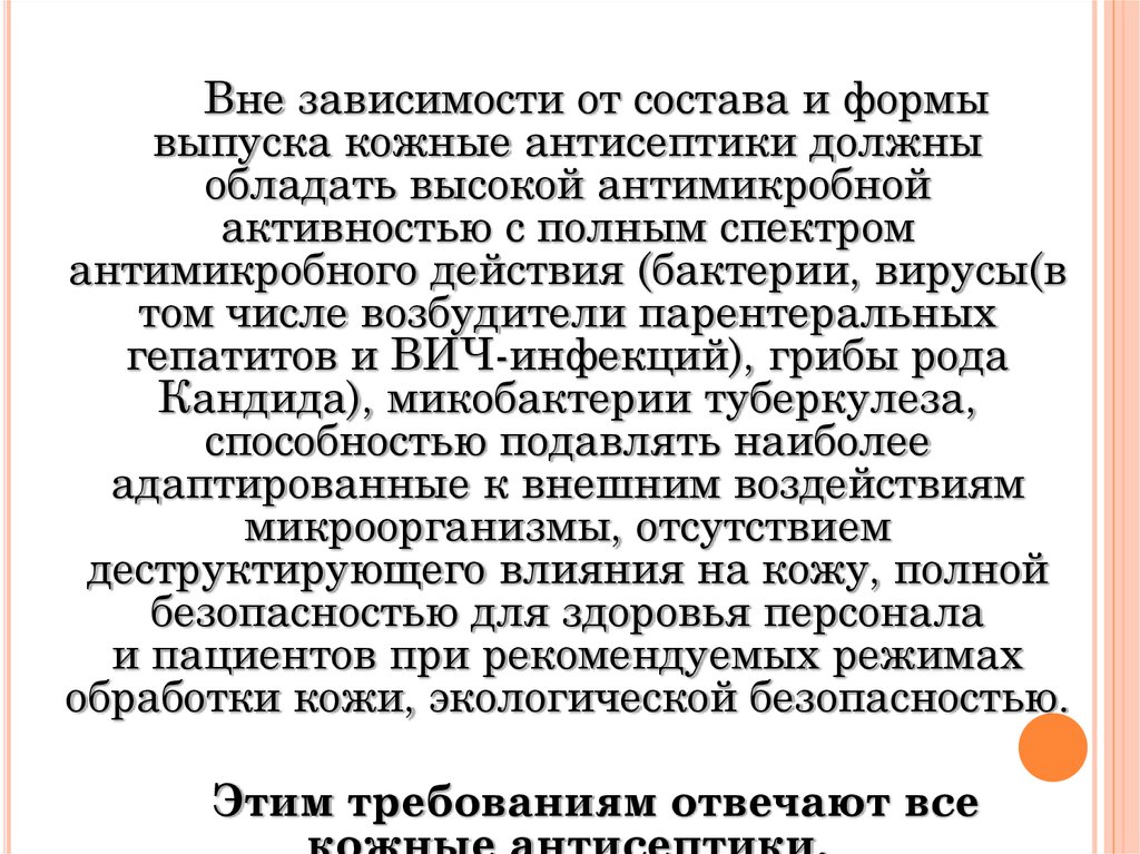 Вне зависимости от состава и формывыпуска кожные антисептики должны