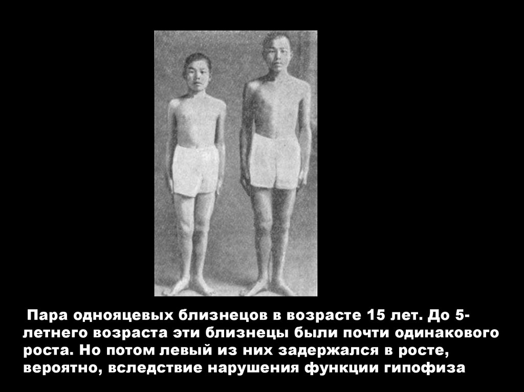 Пара однояцевых близнецов в возрасте 15 лет. До 5летнего возраста эти близнецы были почти одинаковогороста. Но потом левый из них задержался в росте,