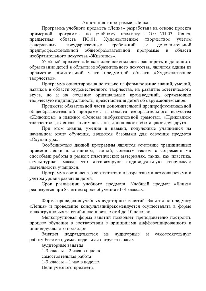 Аннотация к программе «Лепка»Программа учебного предмета «Лепка» разработана на основе проекта