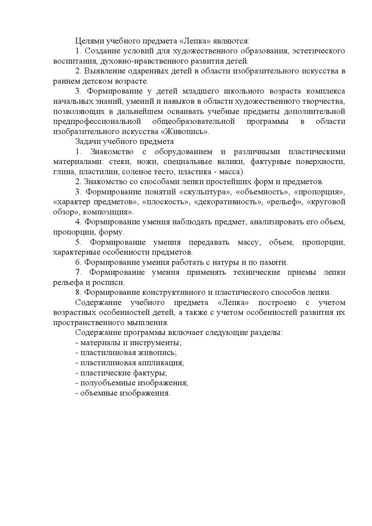 Целями учебного предмета «Лепка» являются:1. Создание условий для художественного образования, эстетического