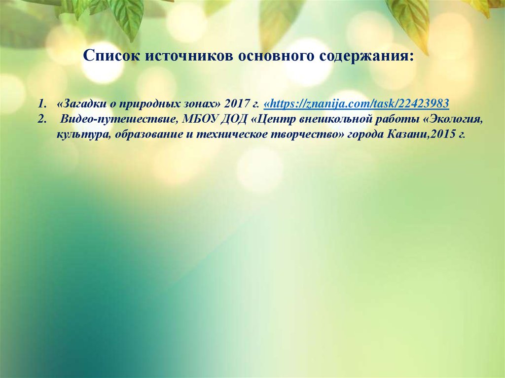Список источников основного содержания:1. «Загадки о природных зонах» 2017 г. «https://znanija.com/task/22423983
