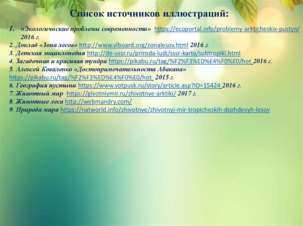 Список источников иллюстраций:1. «Экологичнские проблемы современности» https://ecoportal.info/problemy-arkticheskix-pustyn/