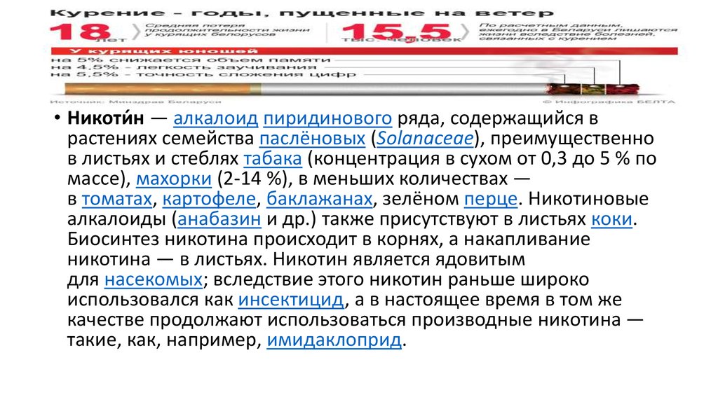 • Никоти́н — алкалоид пиридинового ряда, содержащийся врастениях семейства паслёновых (Solanaceae), преимущественно