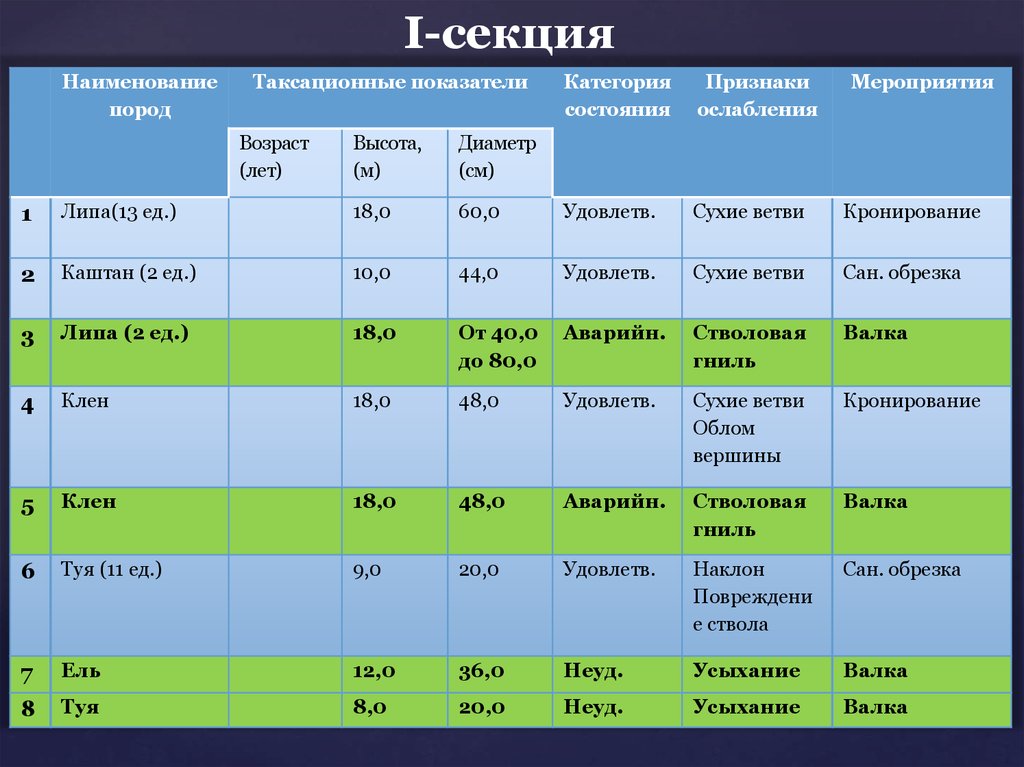 8. Клен категория: Аварийная; признаки: Стволовая гниль. Ель категория: Неудовлетворительно; признаки: Усыхание.