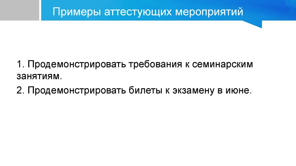 Примеры аттестующих мероприятий1. Продемонстрировать требования к семинарским