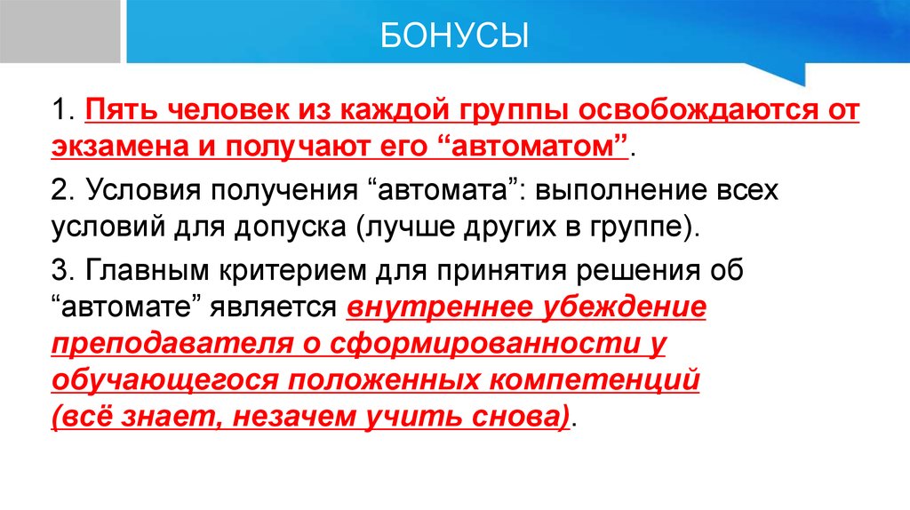 БОНУСЫ1. Пять человек из каждой группы освобождаются от