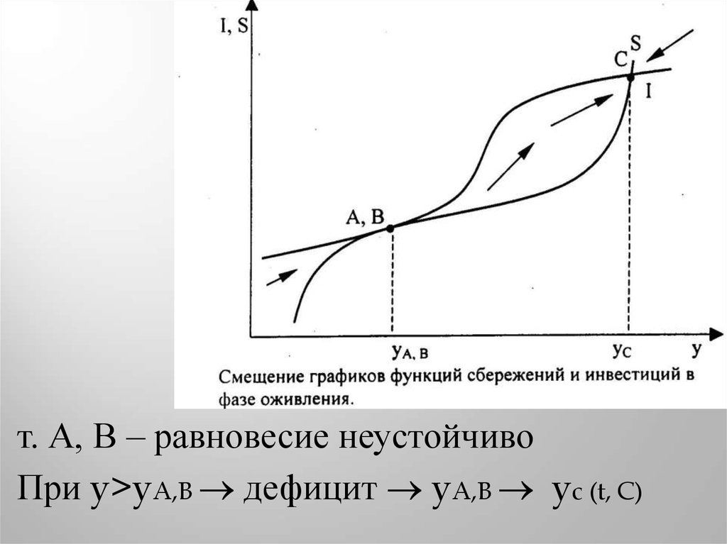 т. А, В – равновесие неустойчивоПри y>yA,B дефицит yA,B yc (t, C)