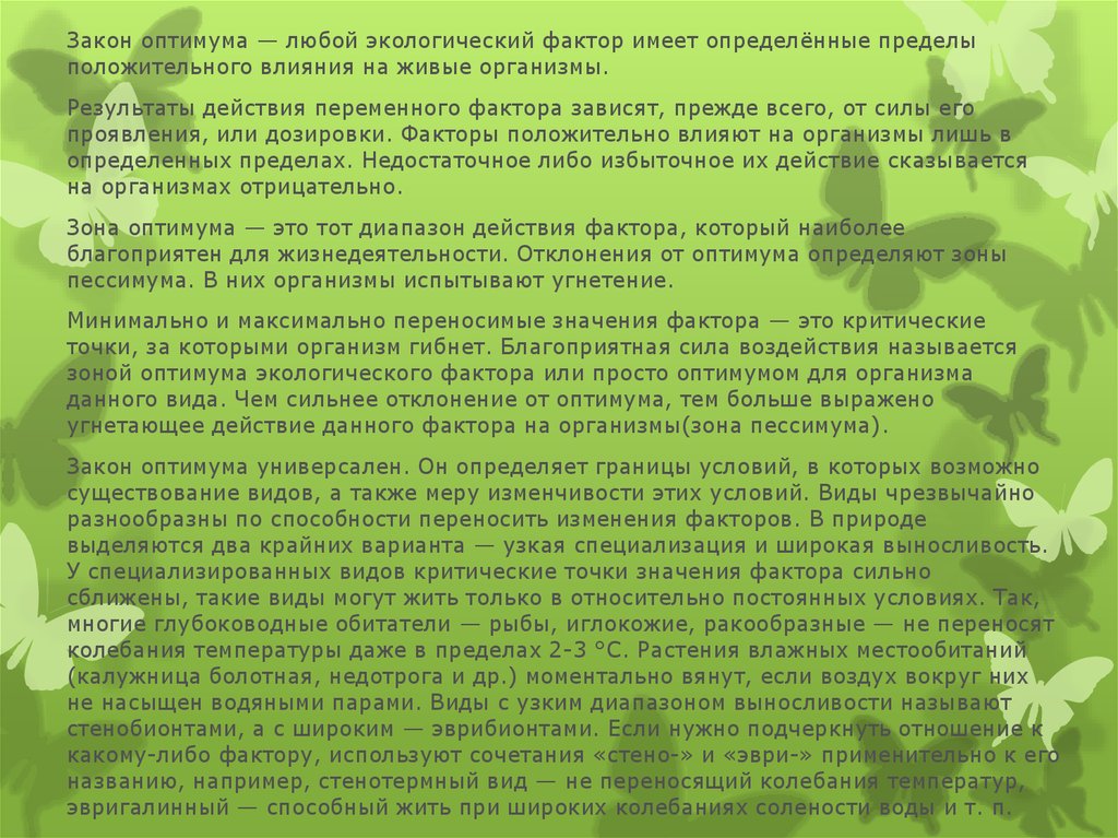 стенобионтами, а с широким — эврибионтами. Если нужно подчеркнуть отношение к