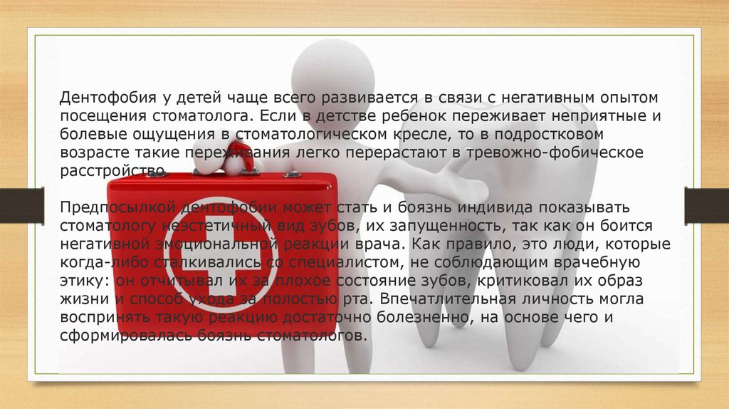 Дентофобия у детей чаще всего развивается в связи с негативным опытомпосещения стоматолога. Если в детстве ребенок переживает неприятные и
