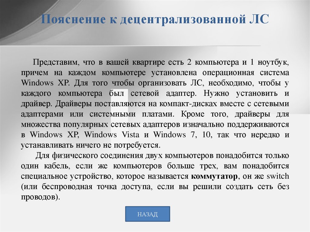 Пояснение к децентрализованной ЛСПредставим, что в вашей квартире есть 2 компьютера и 1 ноутбук,