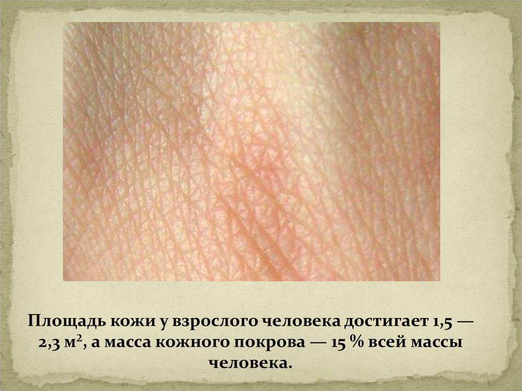 Площадь кожи у взрослого человека достигает 1,5 —2,3 м², а масса кожного покрова — 15 % всей массы