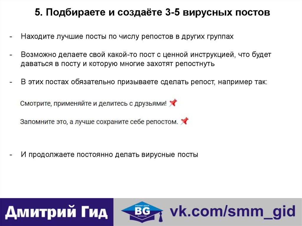 5. Разработать 3-5 вирусных постов и распределить их на всю третью неделю,