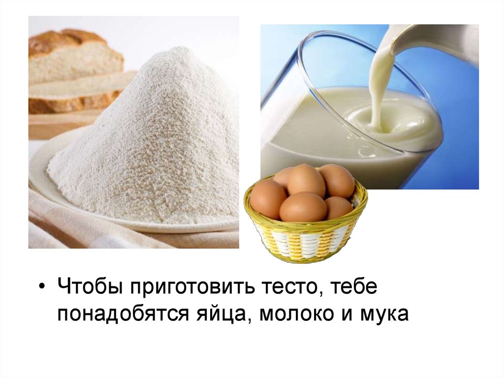 • Чтобы приготовить тесто, тебепонадобятся яйца, молоко и мука