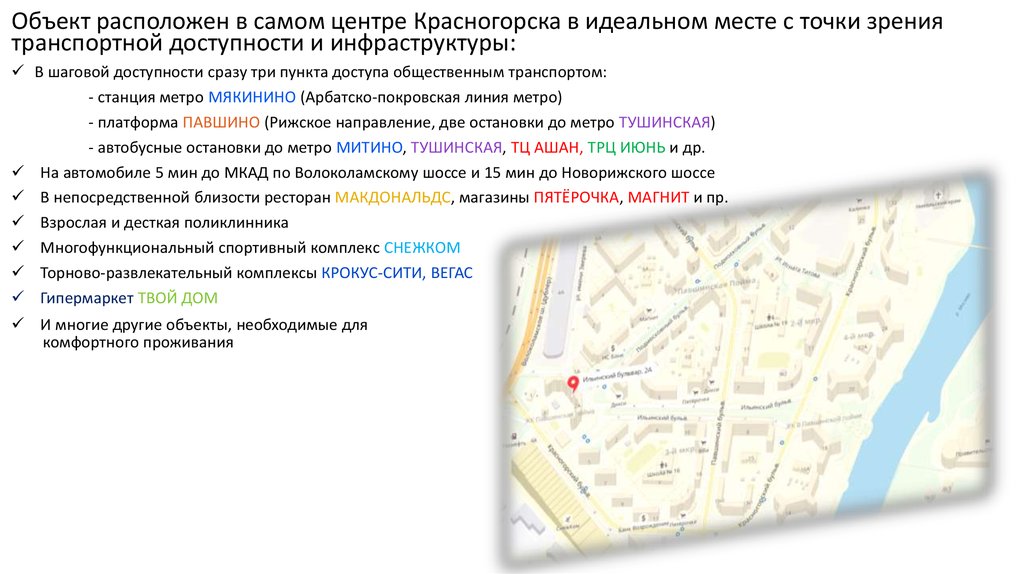 Объект расположен в самом центре Красногорска в идеальном месте с точки зрениятранспортной доступности и инфраструктуры: